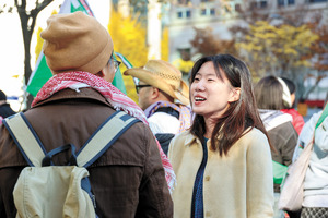 15일 서울 종로구에서 열린 팔레스타인 연대 집회, 사단법인 아디의 권지윤 활동가가 집회 참여자와 대화하고 있다. 추운 날씨에도 세상에 목소리를 내려 모인 사람들. 그 안에서 나와 함께하는 이들과의 대화는 즐겁다. 같은 마음을 확인하는 순간, 함께한다는 즐거움이 주위를 감싼다. 최주혜 기자 choi@