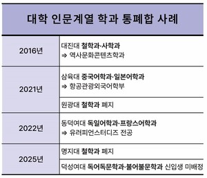 4년제 인문계열 학과 155개 폐지디지털 인문학·융합전공 등장해“인문학과 통폐합은 근시안적 행위” “덕성여대 독어독문학과·불어불문학과 신입생 미배정은 학칙에 없고, 구성원의 의견을 무시한 불법적이고, 비민주적인 결정이다.” 지난달 22일 덕성여대는 독·불문과 신입생 미배정, 259명 규모의 자유전공학부 신설 등이 담긴 학칙 개정안을 의결했다. 곽정연(덕성여대 독어독문학과) 교수는 “평의원 중 한 분은 ‘대학평의회의부결 결정을 수용하지 않고 삼차 동일 안을 상정하고 평의원에 대한 지속 압박을 통해 끝내 통과시킨 것은 대학 민주주의를