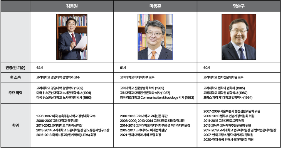 김동원(경영대 경영학과), 마동훈(미디어학부), 명순구(법학전문대학원), 박종훈(의과대 의학과), 유병현(법학전문대학원), 정영환(법학전문대학원) 교수가 제21대 본교 총장 후보자로 나섰다. 본지는 후보자들의 주요 약력과 공약을 살펴봤다. 해당 내용은 후보자들이 제공한 공약집 등을 참고했으며, 공약은 △재정 △공간 △교육권 △복지 △세종캠퍼스의 분야로 나눠 분석했다.