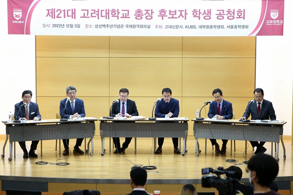 본지와 KUBS, 일반대학원 총학생회(회장=이정우), 서울총학생회(중비대위장=송형훈)가 주최한 이번 행사에서는 본교 총장 후보자 6인(김동원, 마동훈, 명순구, 박종훈, 유병현, 정영환 교수)이 내세운 공약을 중심으로 학생 관련 정책들을 점검했다. 후보자들은 1부에서 △학생 소통 △학생 복지 △교육 비전 △학생 인권 주제로 공통질문에 답했고, 2부에서 총장후보자추천위원회 위원 및 현장 참석자와 질의응답 시간을 가졌다.