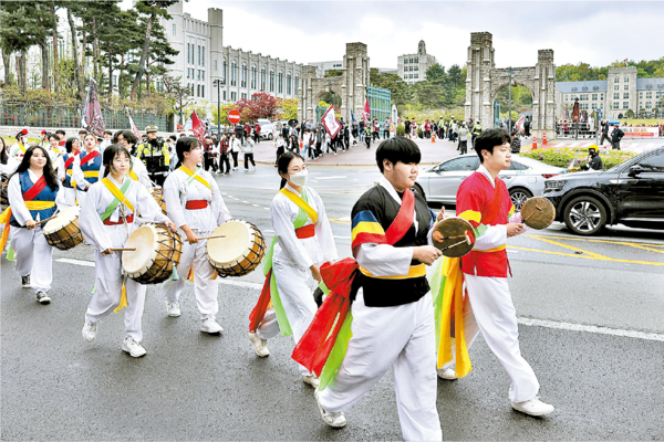 오전 11시, 태평소와 꽹과리 소리를 앞세운 풍물패 연합이 ‘진주삼천포 12차 농악’을 울리며 사전 굿을 하는 동안 학생들이 하나둘 중앙광장에 모였다. 조금씩 비가 내리고 있었지만 우의를 입은 학생들은 선배들의 4·18 의거를 기리기 위해 이 자리에 섰다. 김지은(문과대 한국사22) 씨는 “사학도이자 역사의 주인으로서 4·19 민주 정신을 기리기 위해 왔다”고 전했다.