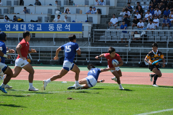 전반전 10분경 이문규가 선제 트라이를 터뜨렸다. 인골 라인 바로 앞에서 라인아웃으로 공격권을 따낸 고려대는 럭을 형성해 공을 왼쪽으로 돌렸고, 가장 왼쪽에 있던 이문규가 패스를 이어받아 트라이로 만들었다. 그러나 전반 14분 한준(연세대22, No.8)의 트라이와 서우현(연세대21, S.O)의 컨버전 킥이 잇따라 성공하며 연세대가 5-7로 리드를 잡았다. 고려대가 전열을 가다듬기도 전에 연세대의 득점이 이어졌다. 전반 20분 스크럼 상황에서 손쉽게 공을 빼낸 연세대는 킥을 이용해 전방으로 공을 넘겼다. 미처 후방으로 복귀하지 못한 고려대 선수들이 빈틈을 보였고, 공을 받은 김태균(연세대 22, S.O)이 여유롭게 인골라인을 돌파하며 점수는 5-14로 벌어졌다. 전반전 32분까지 선수들은 득점을 위해 경기장을 누볐지만 연세대가 흐름을 계속 가져가는 듯했다.