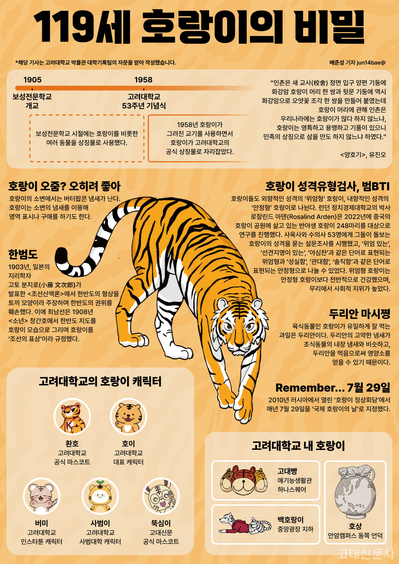 119세 호랑이의 비밀 1958년 호랑이가 그려진 교기를 사용하면서 호랑이가 고려대학교의 공식 상징물로 자리잡았다. *해당 기사는 고려대학교 박물관 대학기록팀의 자문을 받아 작성했습니다. 배준성 기자 jun14bae@ 기자의 다른기사 보기 저작권자 © 고대신문 무단전재 및 재배포 금지 개의 댓글 회원로그인 작성자 비밀번호 댓글 내용입력 댓글 정렬 최신순 추천순 답글순 BEST댓글 BEST 댓글 답글과 추천수를 합산하여 자동으로 노출됩니다. 닫기 더보기 댓글삭제 삭제한 댓글은 다시 복구할 수 없습니다. 그래도 삭제하시겠습니까? 비밀번호 닫기 댓글수정 댓글 수정은 작성 후 1분내에만 가능합니다. 본문 / 400 비밀번호 닫기 내 댓글 모음 닫기