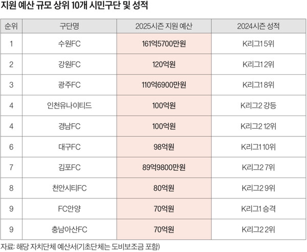 지방자치단체와 지역 시민들의 지원으로 운영되는 축구단인 시민구단은 돈 먹는 하마로 전락했다. 인천유나이티드, 강원FC, 대구FC 등 시민구단은 운영비의 약 80%를 지자체 예산에 의존하므로 구단 운영에 있어 지자체의 눈치를 볼 수밖에 없고 자체 수익을 창출하기 위한 노력도 하고 있지 않다. 이상범(오산대 스포츠지도과) 교수는 “시민구단 자체적으로 마케팅 역량을 강화하거나 성적을 개선해 재정 자립과 독립적인 운영을 이뤄내야 한다”고 말했다.