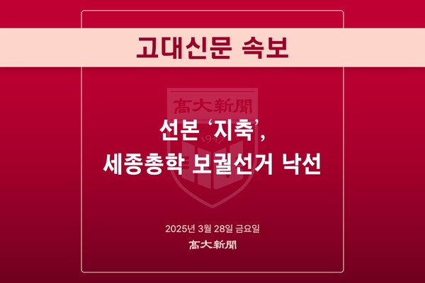 선거운동본부 ‘지축(정후보=박준)’이 제38대 세종총학생회장단에 낙선했다. 선본 지축은 전체 2209표에서 기권 261표를 제외한 1948표 중 찬성 1187표(60.93%)를 얻어 당선 기준 득표율인 70%를 넘기지 못했다. 온라인 투표 방식으로 진행된 이번 선거의 최종 투표율은 개표 요건 37%를 넘긴 43.6%다. 보궐선거가 무산되면서 4월 1일부터 중앙비상대책위원회가 소집될 예정이다.