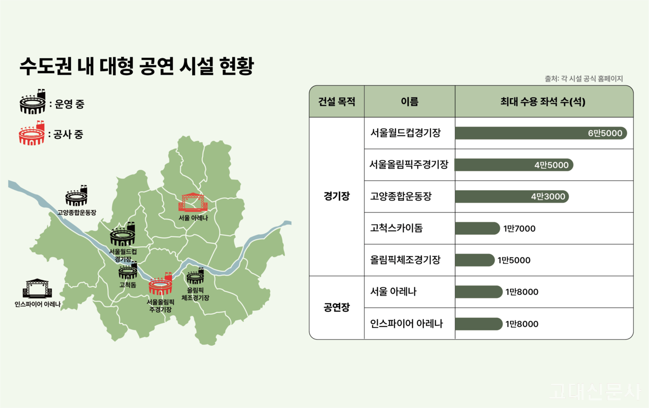 수도권에서 1만 석이 넘는 대형 전문 공연장은 인천 영종도의 인스파이어 아레나와 올림픽체조경기장이 전부이기에 국내 공연 대부분은 스포츠 경기장을 대관해 열린다. 하지만 경기장은 본 목적이 스포츠 경기 개최이므로 경기가 있는 날엔 대관할 수 없다. 최대 6만5000명의 관객을 수용할 수 있는 서울월드컵경기장은 프로축구 시즌인 2월 초부터 11월 말까진 대관이 어려운 날이 많고, 고척스카이돔도 프로야구 시즌인 3월 말부터 10월 초까진 대관이 제한된다. 돔구장이 아닌 실외 경기장의 경우 겨울 시즌엔 추위로 공연 개최가 어려워지는 것도 문제다. 김은성 대표는 “추위와 안전상의 이유로 10월 말부터 3월까지는 야외 공연을 거의 열지 못한다”며 “관람객들은 추운 날씨에 최소 5~6시간을 대기해야 하며 특히 앉아서 관람하면 움직임이 적어 체온이 쉽게 떨어지기도 한다”고 설명했다.