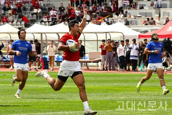 전반전, 고려대는 트라이와 킥을 가볍게 성공하며 압도적인 경기력을 보였다. 전반 8분 오동호(사범대 체교24, WTB)가 경기장 측면을 빠르게 돌파해 선제 트라이를 성공시켰다. 이문규(사범대 체교22, WTB)가 컨버전 킥을 성공하며 고려대가 7점 앞섰다. 14분 연세대 인골라인 부근 스크럼에서 김찬경(사범대 체교25, S.H)의 패스를 받은 오동호가 두 번째 트라이를 성공시켰다. 김원주(사범대 체교23, CTB)는 연세대 백스가 따라잡지 못하는 빠른 속도로 트라이에 성공했다. 컨버전 킥 역시 성공하며 스코어는 21-0. 33분 고려대 인골라인 근처에서 한준(연세대22, LOCK)이 힘으로 전선을 밀어 트라이하고 김지철의 컨버전 킥도 성공하며 21-7로 연세대가 따라붙었다. 이후 연세대가 라인을 올리며 강하게 압박해왔지만 고려대는 실점을 허용하지 않고 전반을 마무리했다.