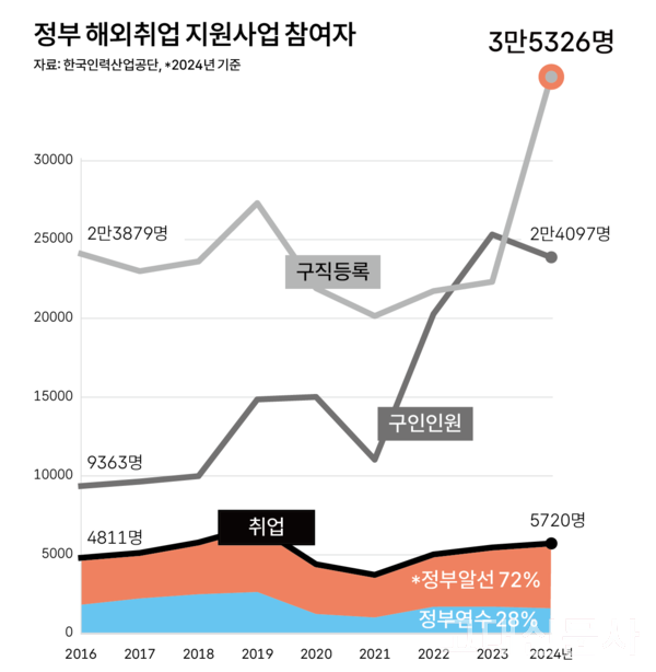 한국산업인력공단에 따르면 정부 지원 사업으로 해외에 취업한 청년은 2016년 4811명에서 2024년 5720명으로 매년 점진적으로 늘었다. 올해까지 약 20만 명 이상의 청년이 이러한 지원 제도를 이용한 것으로 나타났다. 정부가 해외 취업을 지원하기 시작한 1998년에는 환율이 높아 해외에서 국내보다 높은 임금을 받기 쉬웠지만 최근에는 이를 기대하기 어려워졌다. 한국 경제가 성장하며 선진국과 임금 수준이 비슷해졌기 때문이다. 김민규 한국직업능력연구원 부연구위원은 “현지 적응의 어려움이나 문화·제도 차이 등 리스크를 비용으로 환산해 고려하면 통상 한국보다 3~4배 더 벌어야 경제적 이유로 해외 취업을 선택한다”고 전했다.