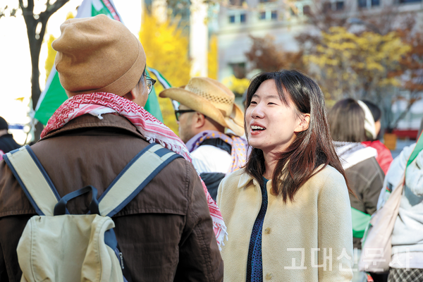 15일 서울 종로구에서 열린 팔레스타인 연대 집회, 사단법인 아디의 권지윤 활동가가 집회 참여자와 대화하고 있다. 추운 날씨에도 세상에 목소리를 내려 모인 사람들. 그 안에서 나와 함께하는 이들과의 대화는 즐겁다. 같은 마음을 확인하는 순간, 함께한다는 즐거움이 주위를 감싼다.