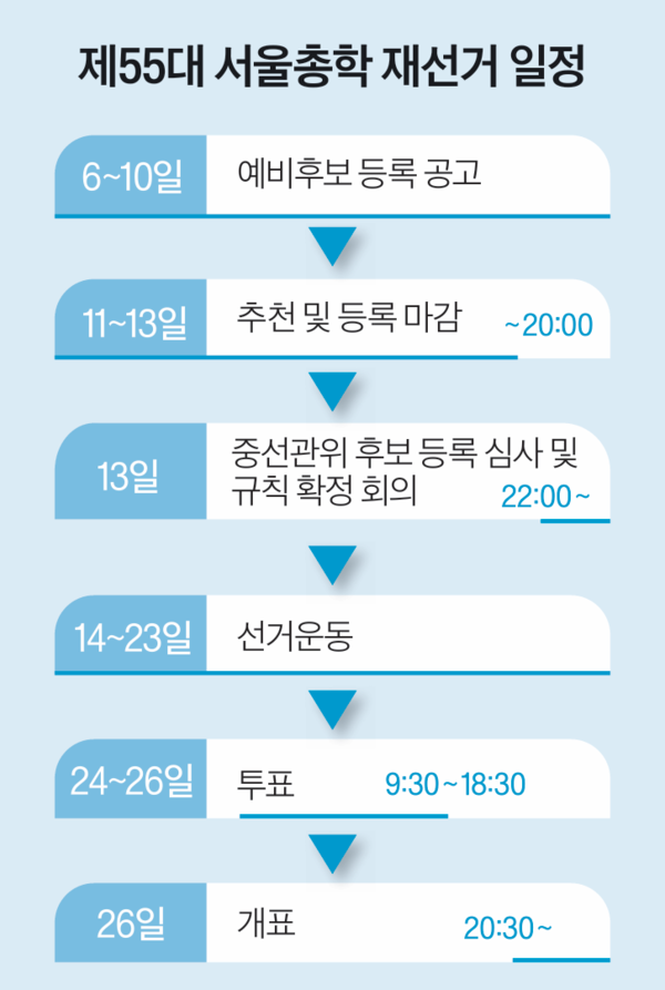 제55대 서울총학생회장단 재선거에 선거운동본부 ‘바다(정후보=이정원)’가 단독으로 출사표를 던졌다. 예비후보는 오는 13일 오후 8시까지 학부생 600명 이상의 추천을 받으면 서울총학생회 중앙선거관리위원회(위원장=유혜영, 이하 ‘중선관위’) 의결을 거쳐 본후보가 된다. 지난해 11월 개정된 선거시행세칙에 따라 단과대·독립학부 재선거도 서울총학생회장단 재선거와 동시에 시행된다. 유혜영 중선관위장은 “투표를 동시에 진행해 투표 참여율이 높아지길 기대한다”고 밝혔다.