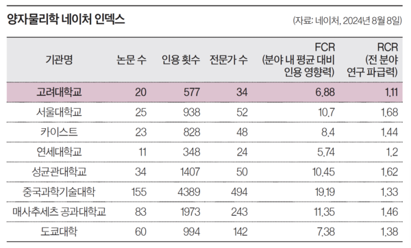 그러나 커지는 지원 규모에 반해 지표상 성과는 미비하다. 네이처 인덱스에 따르면 고려대의 양자 기술 관련 논문 수는 약 20편으로 국내 대학 중 4위다. 연세대 등 타 대학은 양자컴퓨터를 도입하고 활용하는 소프트웨어 연구가 주를 이루지만 고려대는 양자컴퓨터를 직접 만들기 위한 기술을 연구하는 하드웨어 분야에 집중하고 있기 때문이다. 김민혁(이과대 물리학과) 교수는 “물리학과 내 양자를 연구하는 6명의 교수 중 5명이 하드웨어 분야 전공이고 실험 중심의 연구가 많아 논문 작성 속도가 느린 게 당연하다”고 설명했다. 논문 인용 횟수도 577회로 서울대와 카이스트의 절반, 1위인 성균관대의 3분의 1 수준이다. 특정 세부 전공 분야에 연구가 편중돼 있어 타 대학에 비해 분야 내 상대인용지수(FCR) 대비 전 분야 상대인용지수(RCA)도 낮다.