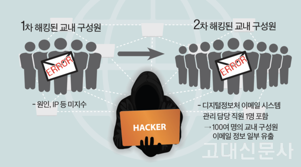 디지털정보처에 따르면 해커는 각각 다른 프로그램을 활용해 1, 2차로 교내 구성원의 PC를 해킹했다. 김승주 처장은 “교내 구성원의 PC가 1차 해킹 프로그램에 의해 해킹돼 메일 주소와 비밀번호가 탈취됐다”며 “이후 해커가 교내 구성원인 척 또 다른 해킹 프로그램이 포함된 이메일을 2차로 유포했다”고 설명했다. 2차 공격으로 이메일 시스템을 관리하는 디지털정보처 직원의 PC가 해킹돼 교내 구성원 간 이메일 기록이 유출되기도 했다. 발신자와 수신자를 포함해 피해자 100여 명의 발신자 및 수신자명, 메일 제목이 유출됐고 일부 이용자의 경우 메일 내용까지 유출됐다. 김현경(스마트보안22) 씨는 “디지털정보처장님과 추천서 관련 메일을 주고받았는데 대학 생활과 관련된 내용까지 유출돼 당황스럽다”고 말했다.